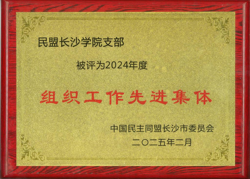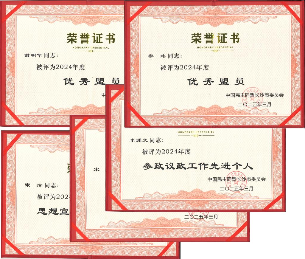 近日,经民盟长沙市十七届委员会第十八次常委会议研究决定,对2024年度“争创先进集体、争当先进个人”活动中表现突出的集体和个人进行表彰。我校民盟支部在 2024 年度工作中表现突出,斩获得多项荣誉:支部被评为“2024 年度组织工作先进集体”;宋玲同志被评为“2024年度组织发展工作、思想宣传工作先进个人”,李玮、谢明华同志被评为“2024 年度优秀盟员”,李渊文同志被评为“参政议政工作先进个人”。