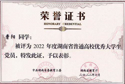 近日,中共湖南省委教育工委、湖南省教育厅下发《关于评选表彰2022 年度湖南省普通高校优秀大学生党员的通知》(湘教工委通〔2022〕14 号),我校曹阳、黄玉兰两位同学被授予“2022年度湖南省普通高校优秀大学生党员”荣誉称号。