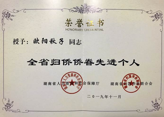 湖南省人力资源和社会保障厅、湖南省归国华侨联合会表彰了80名全省归侨侨眷先进个人。我校侨联常务副主席欧阳秋子同志继2009年、2014年连续两届评为全省归侨侨眷先进个人、2018年评为全国归侨侨眷先进个人后,再次获此殊荣。