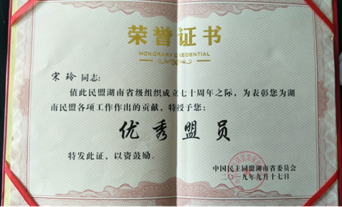 会议对在思想建设、组织建设、参政议政、社会服务、机关建设和本职工作等方面做出重要贡献、成绩突出的集体和个人进行了表彰。经我校民盟支部推选、开福区工委筛选、盟市委机关会议、常委会讨论审核通过后报盟省委,我校民盟支部成员、法学院宋玲老师因在参政议政、服务社会等各方面表现突出,在全省1.2万盟员中脱颖而出,被授予省级“优秀盟员”称号,为学校赢得了荣誉。