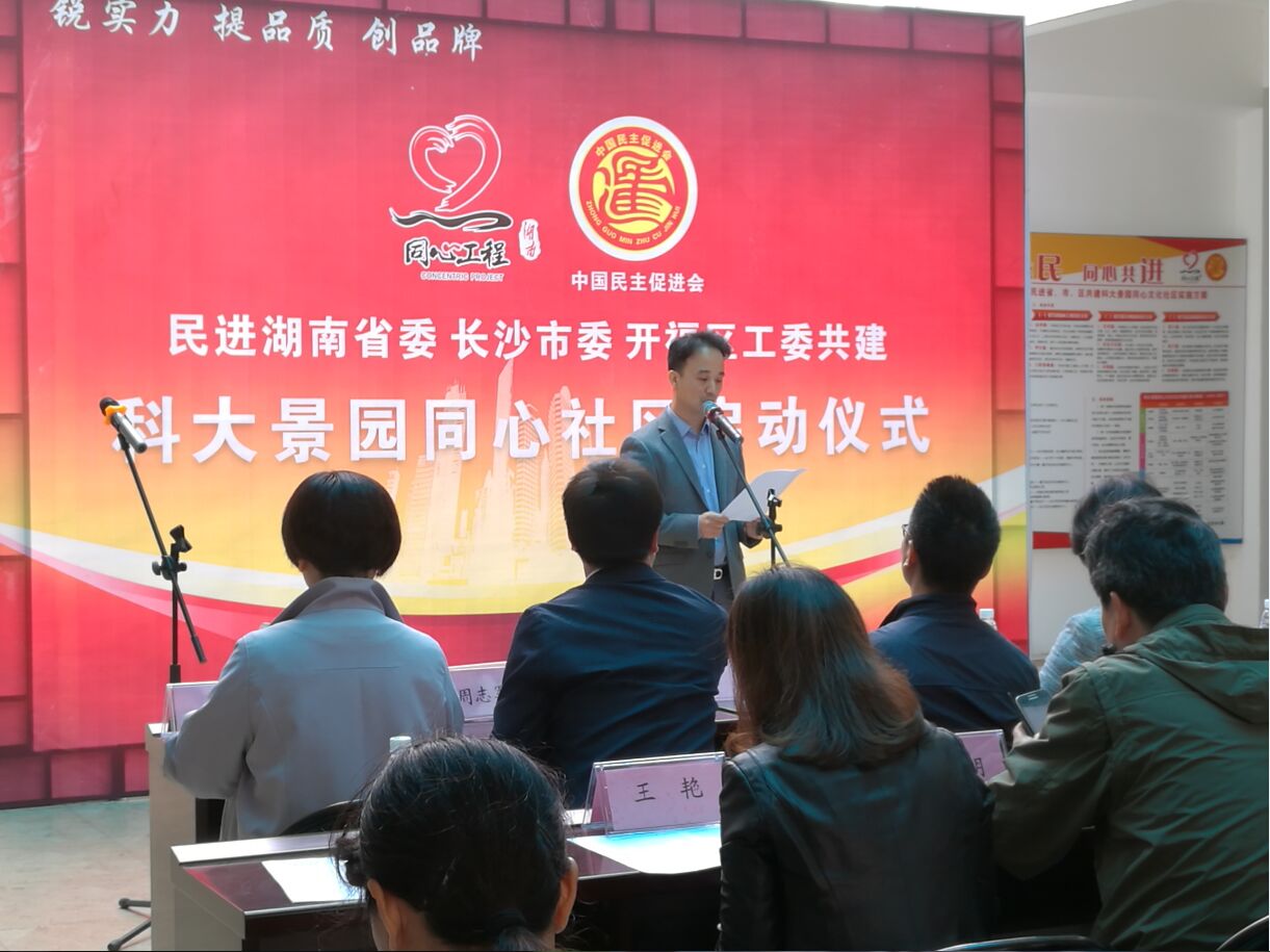 4月16日上午10点,民进湖南省委.长沙市委.开福区工委共建同心社区启动仪式在科大景园社区隆重举行。湖南省委统战部政策理论研究室主任马碧.长沙市统战部副部长饶福明等参加了启动仪式,并举行了省市民进共建的揭牌仪式。民进长沙学院支部参加了此次活动。
