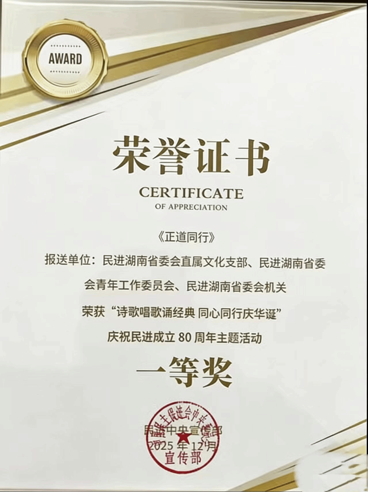 为庆祝中国民主促进会成立80周年,民进中央组织开展“写诗唱歌诵经典 同心同行庆华诞”主题作品征集活动。由民进湖南省委会选送、民进长沙学院支部主委曾小海参与主创的歌曲《正道同行》脱颖而出,荣获一等奖。